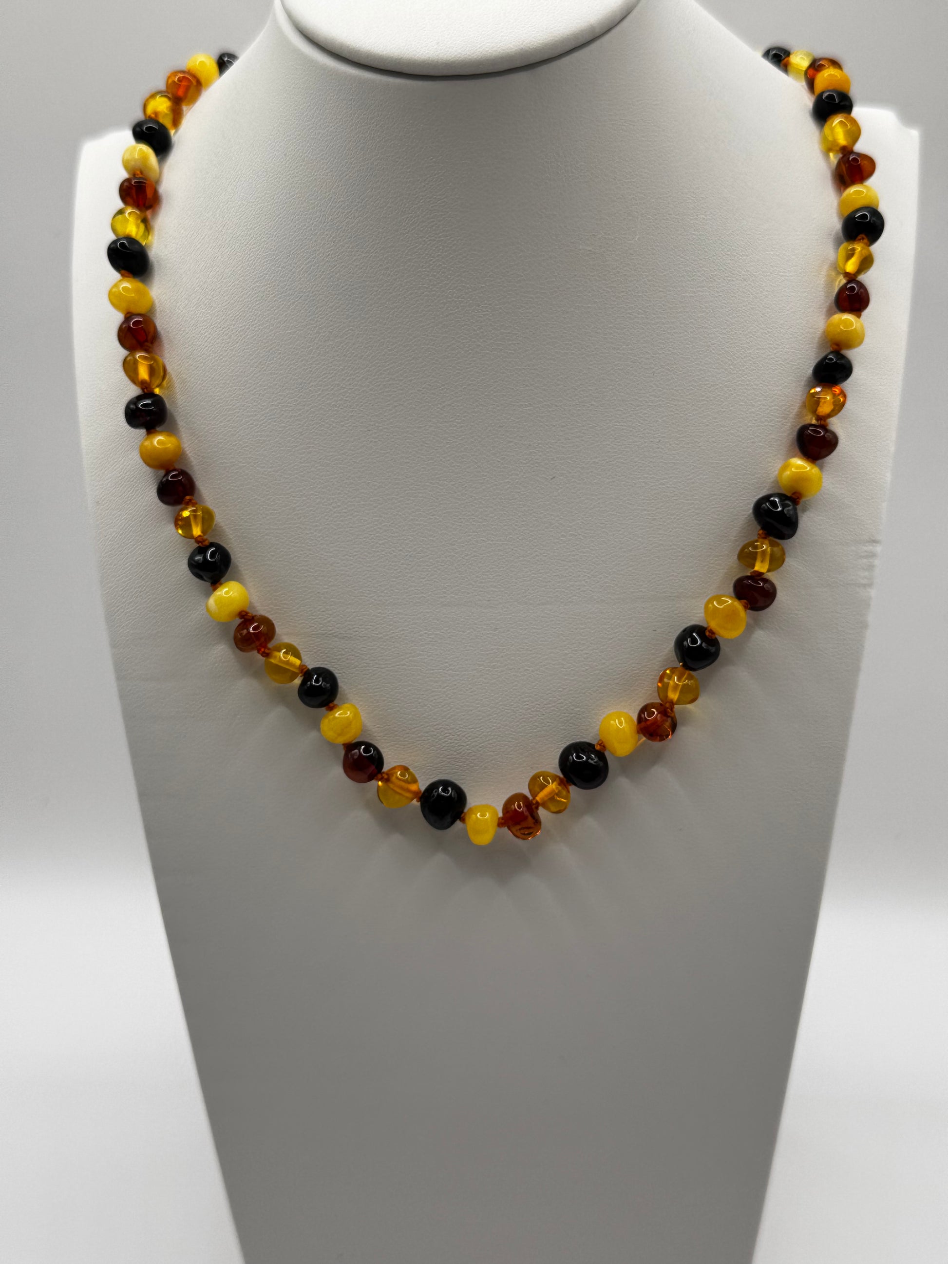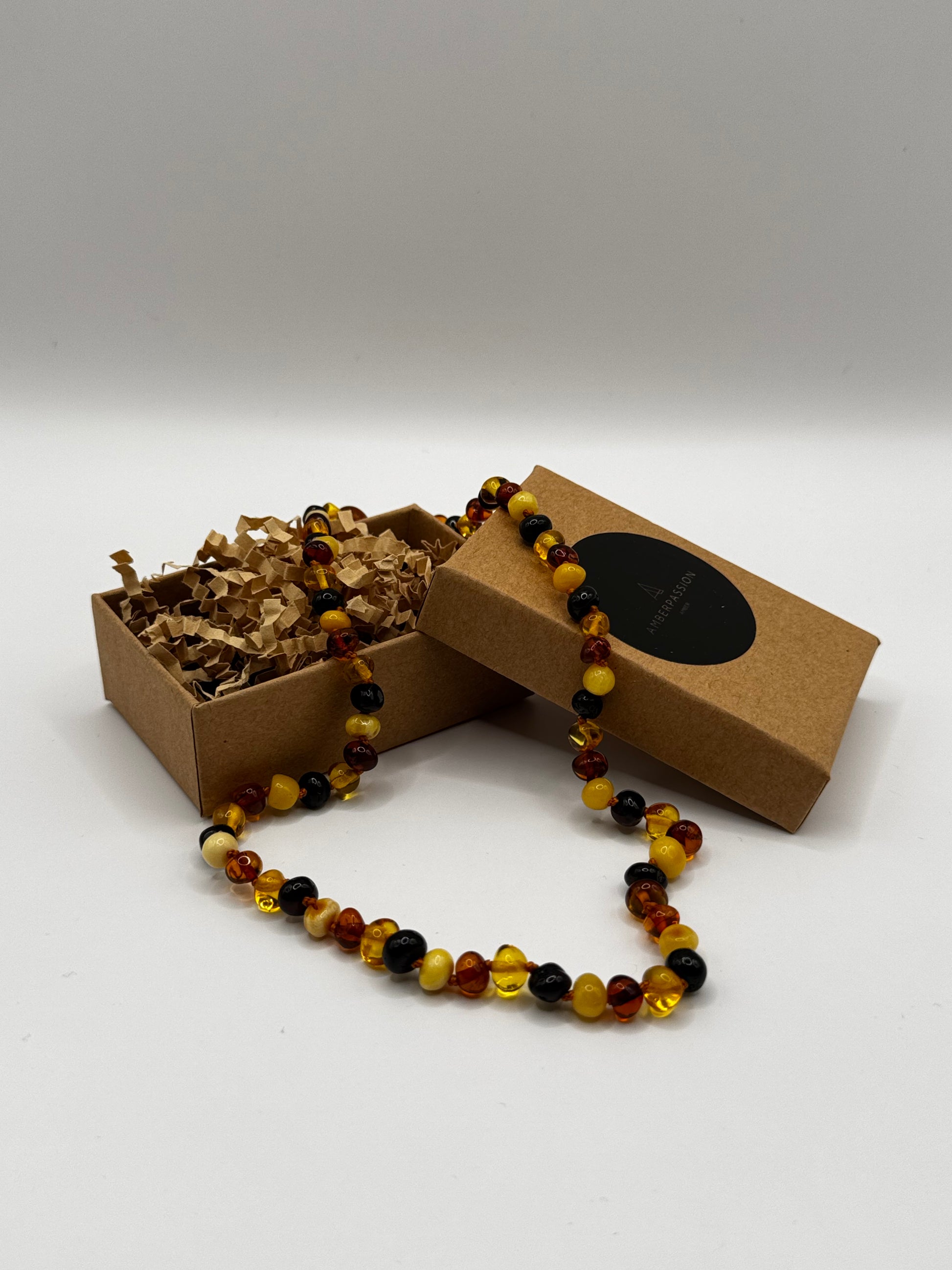 💛🤎 This polished Baltic amber necklace features a colorful mix of cherry, honey, cognac, and lemon amber beads, handmade in Lithuania. It is believed to provide natural relief for teething discomfort and promote a sense of calm.