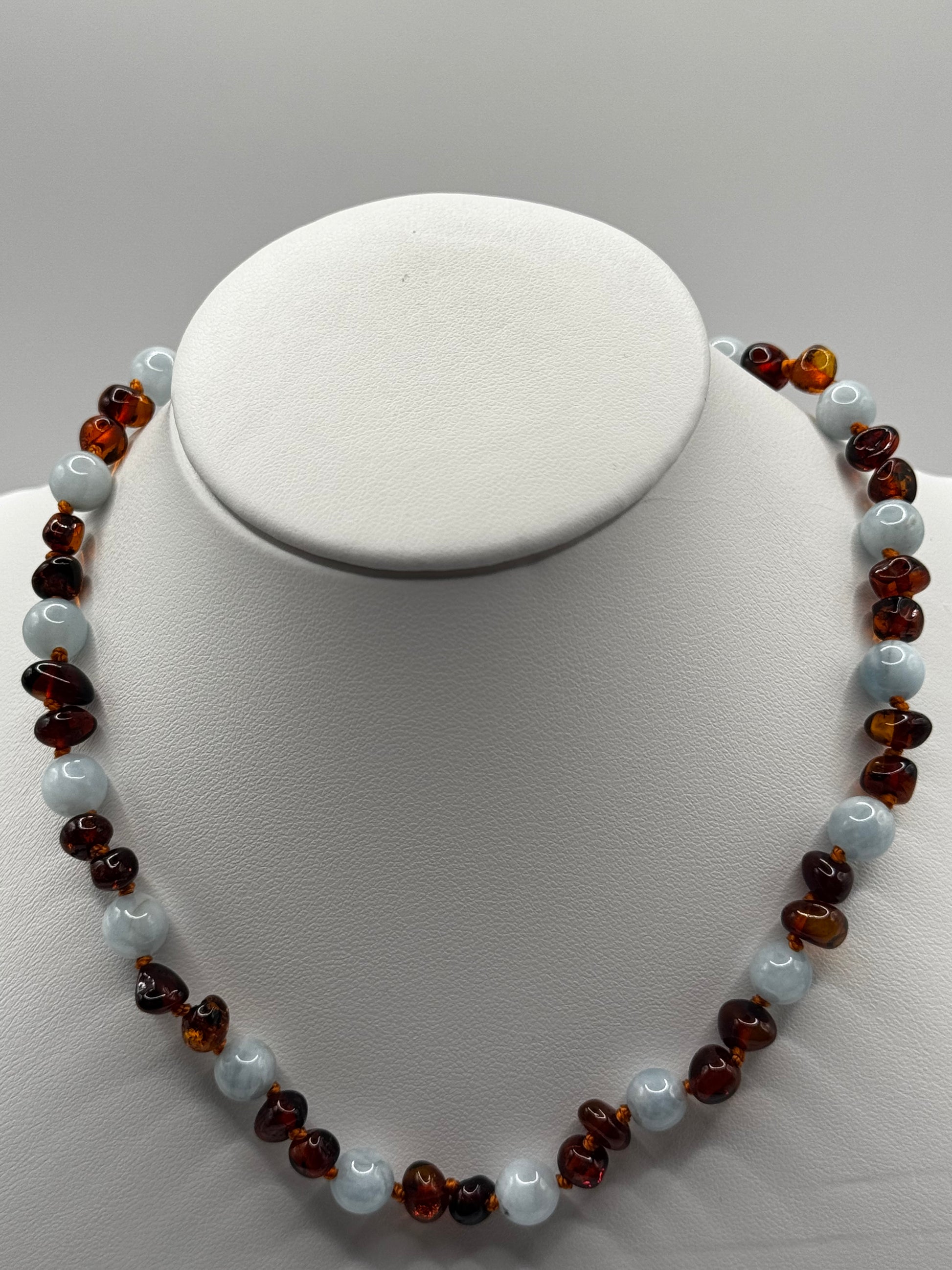 🤍🩵This calming children’s necklace combines the warm, healing energy of genuine Baltic amber with the peaceful, ocean-blue beauty of aquamarine.